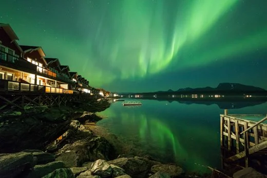 Nach einem Spaziergang von etwa zehn Minuten erreichen Sie das Saunahaus mit Whirlpool – ideal, um sich aufzuwärmen und danach wieder hinaus in die Nacht zu treten. Dann heisst es: Augen nach oben. Die Aurora Borealis ist launisch, doch wenn sie in leuchtenden Bahnen über den Himmel zieht und sich im Fjord spiegelt, bleibt kein Zweifel, warum man hierher kommt. Besonders eindrücklich ist das Nordlicht im hoteleigenen Camp Nikka im Landesinnern an einem kleinen See: Kein elektrisches Licht trübt den Himmel. Lavvus (Tipis) und ein Blockhaus bieten Schutz und Wärme, während draussen die Stille übernimmt.