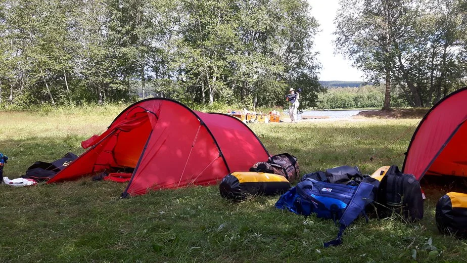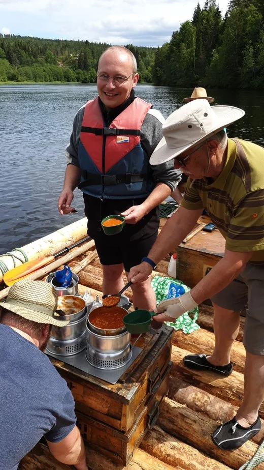 Der heutige Rastplatz lag bei einem Zeltplatz, etwa bei der Hälfte der Strecke. Da unser waidwundes Floss etwas Unterhalt vertragen konnte, sich zudem für den kommenden Tag mieses Wetter angekündigt hatte, wir sehr gut im Zeitplan lagen und uns selber auch etwas Ruhe gönnen wollten, beschlossen wir gleich zwei Nächte zu bleiben und uns auch noch zwei Stugas zu gönnen. Herrlich! Eine warme Dusche! Echte, trockene Betten mit Matratzen! Welch dekadenter Luxus! Auch kulinarisch zeigte sich die Anstrengungen; knapp 2 Kilo Kasseler Schinken, eine ähnliche Menge Reis plus einen Topf Gurkensalat wurden beim Abendessen innert kürzester Zeit restlos verputzt. Glauben Sie es ruhig: Flössen macht hungrig!