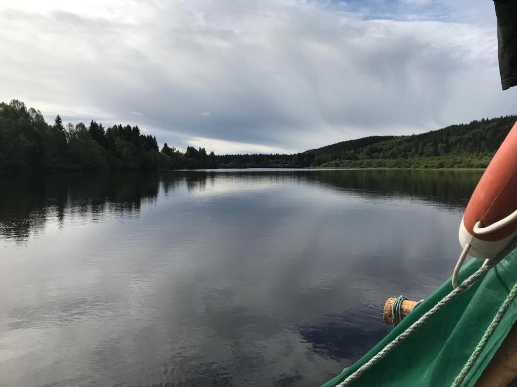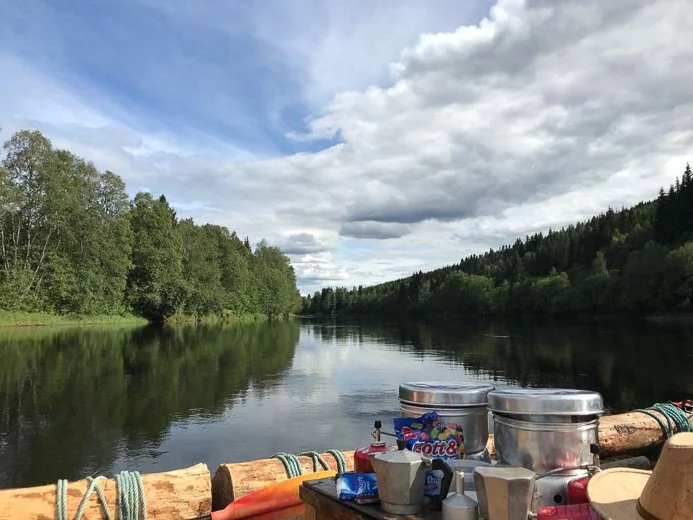 Irgendwann in der Nacht hatte der Regen aufgehört und letzte Tag begann nur noch leicht bewölkt. Wir planten, gegen Mittag in Gunnerud einzutreffen. Mit nur etwa 15 Minuten Verspätung ging dieser Plan auch nahezu perfekt auf – ein letztes Mal paddelte unser «Chef-Anleger» mit dem Kajak voraus, um unser Floss mit einem Seil an einem Baum festzumachen und als hätten wir noch nie etwas anderes gemacht, kam unser Floss perfekt vor der Ausstiegsstelle zum stehen.