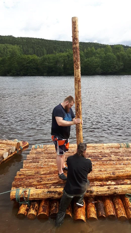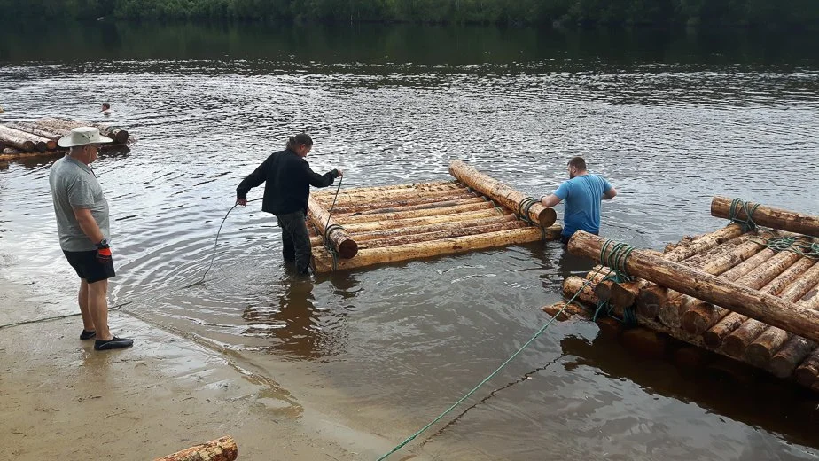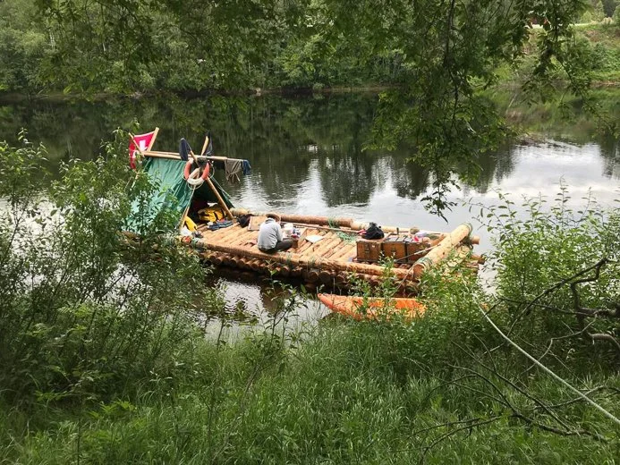 Der nächste Morgen brachte uns Sonnenschein und viel Arbeit – unser ganzes Gepäck, immerhin 5 grosse Holzkisten mit Material wie Planen, Küchenausrüstung, Schwimmwesten, etc. so wie unser eigenes Gepäck wollte in Lastwagen und Car verstaut werden. Diese brachten uns und die anderen Teams an unseren Bauplatz in Branäs, 100 Flusskilometer nördlich, wo uns riesige Stapel aus Rundholz, noch mehr Materialkisten und zwei Instruktoren erwarteten. Baubeginn! Weder gelegentliche Regenschauer, wütende Wespen, noch das kalte Flusswasser liess uns dabei beirren. Man stelle sich vor: da steht man bei bescheidenen 17°C in Badehose und T-Shirt im Wasser, es regnet, man friert und trotzdem alle haben einen Riesenspass daran – wird uns dies zu Hause wirklich jemand glauben? Gegen Abend war dann unser schwimmender Untersatz fertig, beladen und bereit zum ablegen – wir entschieden uns allerdings, noch eine Nacht vor Ort zu verbringen.