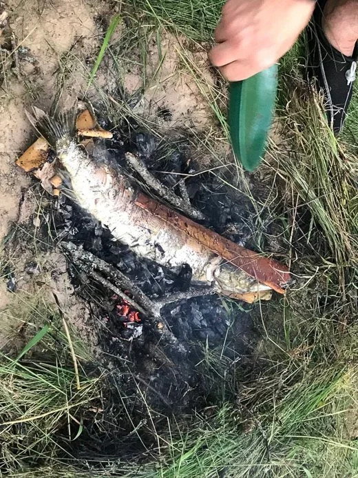 Vom Schlafen auf dem Floss wurde dann aus Komfortgründen schnell abgesehen, weshalb wir unser Nachtlager auf einer flachen Stelle oberhalb des Ufers aufschlugen. Irgendwo mussten wir ja auch noch ein Feuer machen, um den gefangenen Hecht zubereiten zu können. Eine Delikatesse!